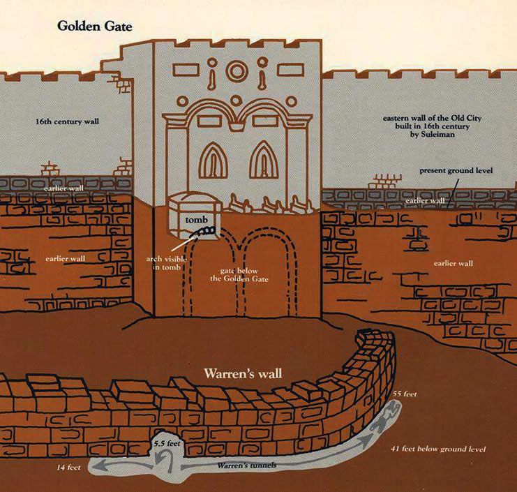 The Lower Gate was built on a stone foundation and was set into an earlier city wall. The present 16th-century A.D. wall was built on top of this earlier wall. Two to three courses of this earlier wall may still be seen above ground level and are shown in the drawing as rectangular stones with rough, projecting faces and three-to six-inch margins around their edges. These stones are much larger than and different from the masonry in the wall built on top of them...Forty-one feet below ground level and 46 feet in front of the eastern wall of the Old City is a wall discovered in 1867 by Captain Charles Warren. Warren encountered the wall after he sank a shaft 143 feet east of the Golden Gate and then burrowed westward underground along bedrock toward the Temple Mount. This underground wall obstructed his progress, so he tried to chisel through it in order to reach the Old City wall. After penetrating 5.5 feet into the underground wall and failing to come out on the other side, he decided to tunnel south to try to get around the wall. After tunneling 14 feet south without coming to the end, Warren turned around and dug north for 55 feet until an earthfall in the tunnel stopped him. Shortly before he was forced to stop tunneling, Warren observed that this underground wall obstructing his progress had started to curve west toward the Golden Gate and the Old City wall.